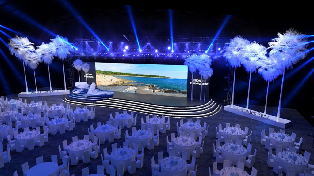 تجهيزات الصوت والإضاءة للقاعات، والديكور العام.
